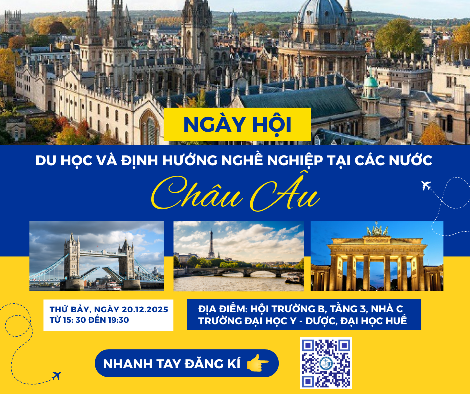 NGÀY HỘI “DU HỌC VÀ ĐỊNH HƯỚNG NGHỀ NGHIỆP TẠI CÁC NƯỚC CHÂU ÂU” ✨Ngày hội nhằm giới thiệu văn hóa, đời sống và môi trường học tập tại các quốc gia Châu Âu, đồng thời cung cấp thông tin về cơ hội du học, trao đổi, hợp tác và phát triển nguồn nhân lực y tế giữa Châu Âu và Việt Nam, cũng như các chương trình hợp tác của Trường Đại học Y - Dược, Đại học Huế. ✨Sự kiện là dịp kết nối giảng viên, lưu học sinh và cựu sinh viên đã và đang học tập, làm việc tại Châu Âu; chia sẻ kinh nghiệm thực tiễn về du học, thực tập và định hướng nghề nghiệp quốc tế, đồng thời giới thiệu các khóa học ngôn ngữ phổ biến tại Châu Âu.
