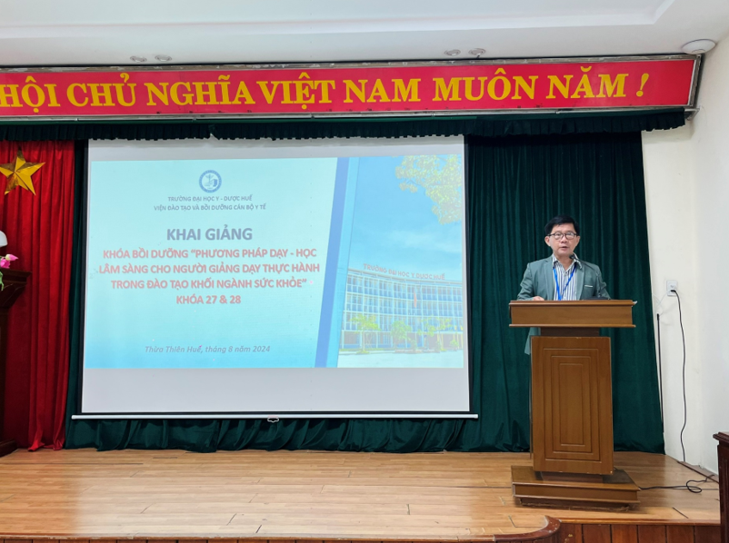 Sáng ngày 15/8, tại Trường Đại học Y - Dược, Đại học Huế đã tổ chức khai giảng 02 Khóa bồi dưỡng “Phương pháp dạy - học lâm sàng cho người giảng dạy thực hành trong đào tạo khối ngành sức khỏe” – Khóa 27 và 28 dành cho giảng viên của Nhà trường và các cán bộ y tế trực tiếp tham gia hướng dẫn thực hành lâm sàng tại Bệnh viện Trường, Bệnh viện Trung ương Huế và một số bệnh viện trên địa bàn tỉnh Thừa Thiên Huế gồm có: Bệnh viện Da liễu tỉnh Thừa Thiên Huế, Bệnh viện Mắt Huế, Bệnh viện Y học cổ truyền tỉnh Thừa Thiên Huế, Bệnh viện Phục hồi chức năng tỉnh Thừa Thiên Huế và Bệnh viện Tâm thần Huế.