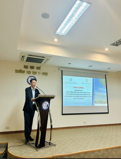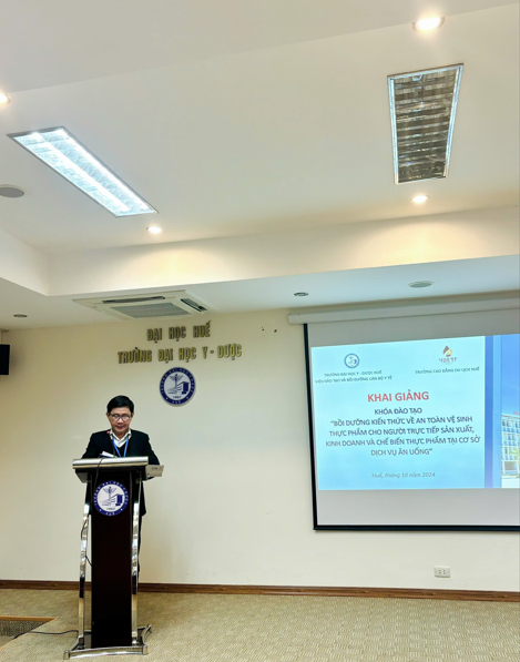 Sáng ngày 01/11/2024, Trường Đại học Y - Dược, Đại học Huế đã phối hợp với Trường Cao đẳng Du lịch Huế tổ chức khai giảng Khóa đào tạo "Bồi dưỡng kiến thức về an toàn vệ sinh thực phẩm cho người trực tiếp sản xuất, kinh doanh và chế biến thực phẩm tại cơ sở dịch vụ ăn uống” dành cho 30 học viên của Trường Cao đẳng Du lịch Huế. Tham gia lễ khai giảng, về phía Trường Đại học Y - Dược, Đại học Huế có TS.BS. Ngô Viết Lộc - Phó Giám đốc Viện Đào tạo và Bồi dưỡng cán bộ y tế; TS.BS. Hoàng Thị Bạch Yến - Trưởng Bộ môn Dinh dưỡng – Sức khỏe môi trường và Nghề nghiệp, Trưởng khoa Dinh dưỡng - Tiết chế; TS.GVC. Nguyễn Thị Thanh Nhàn - Bộ môn Dinh dưỡng – Sức khỏe môi trường và Nghề nghiệp, Phó Trưởng khoa Dinh dưỡng - Tiết chế; ThS.BS. Bùi Thị Phương Anh - Bộ môn Dinh dưỡng – Sức khỏe môi trường và Nghề nghiệp, Khoa Y tế Công cộng, Trường Đại học Y – Dược, Đại học Huế; TS. Trần Thị Táo, Bộ môn Dinh dưỡng – Sức khỏe môi trường và Nghề nghiệp, Khoa Y tế Công cộng, Trường Đại học Y – Dược, Đại học Huế. Về phía Trường cao đẳng Du lịch Huế có ThS. Phạm Bá Hùng, Hiệu trưởng Trường Cao đẳng Du lịch Huế; ThS. Lê Thị Hoài Hương, Trưởng khoa Quản trị Khách sạn, Nhà hàng; ThS. Lê Công Hùng, Trưởng khoa Quản trị Chế biến món ăn; ThS. Nguyễn Thị Hoa, Giám đốc Trung tâm đào tạo Thực hành nghề Du lịch và sự có mặt của 30 học viên.