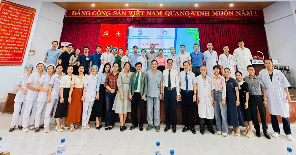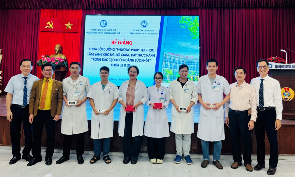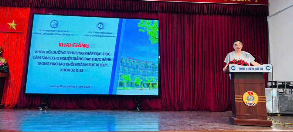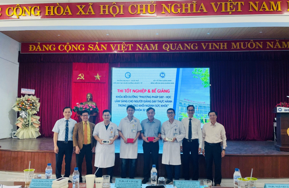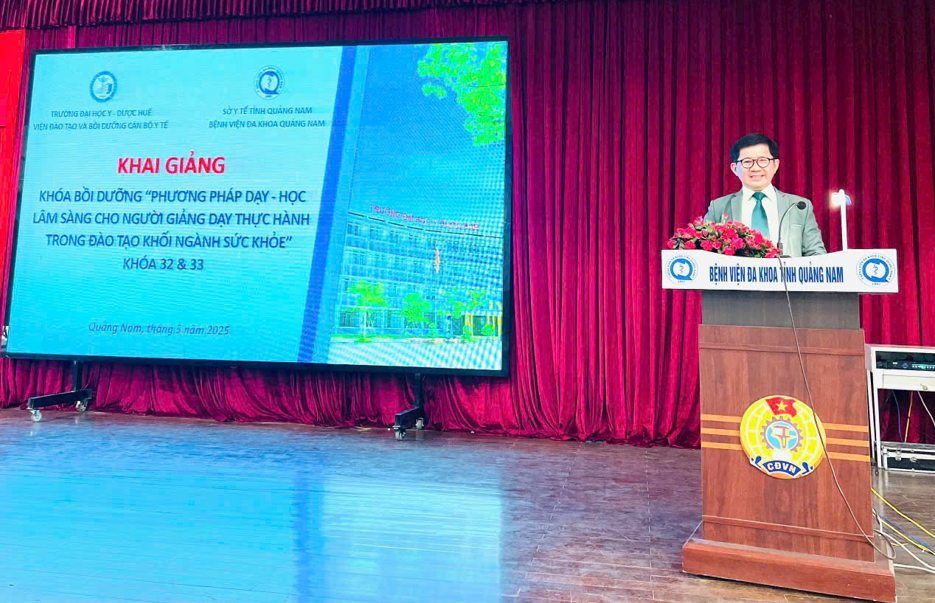 Sáng ngày 09/5, Trường Đại học Y - Dược, Đại học Huế đã phối hợp với Bệnh viện Đa khoa Quảng Nam tổ chức khai giảng 02 Khóa bồi dưỡng “Phương pháp dạy - học lâm sàng cho người giảng dạy thực hành trong đào tạo khối ngành sức khỏe” dành cho các cán bộ y tế đang công tác tại bệnh viện. Tham gia lễ khai giảng, về phía Trường Đại học Y - Dược, Đại học Huế có TS.BS. Lê Văn Chi - Nguyên Chủ tịch Hội đồng trường, Nguyên Phó Trưởng Bộ môn Nội, PGS.TS. Đặng Công Thuận - Trưởng Phòng Khoa học công nghệ - Hợp tác quốc tế, TS.BS. Đoàn Văn Minh - Trưởng Khoa Y học cổ truyền, TS.BS. Ngô Viết Lộc - Phó Giám đốc Phụ trách Viện Đào tạo và Bồi dưỡng cán bộ y tế; về phía Bệnh viện Đa khoa Quảng Nam có BSCKII. Phạm Ngọc Ẩn - Giám đốc Bệnh viện, BSCKII. Nguyễn Ngọc Văn Khoa - Phó Giám đốc Bệnh viện, BSCKII. Nguyễn Tam Thăng - Phó Giám đốc Bệnh viện, DSCKII. Nguyễn Văn Ngọc - Phó Giám đốc Bệnh viện và sự có mặt của 72 học viên Khoá 32 và Khoá 33. Phát biểu tại lễ khai giảng, BSCKII. Phạm Ngọc Ẩn - Giám đốc Bệnh viện nhấn mạnh tầm quan trọng của khóa học, mong muốn các cán bộ sắp xếp thời gian, tham gia lớp học đầy đủ và cảm ơn Trường Đại học Y - Dược, Đại học Huế đã tạo điều kiện phối hợp với bệnh viện để tổ chức 02 Khóa bồi dưỡng cho cán bộ y tế theo quy định của Bộ Y tế ban hành.