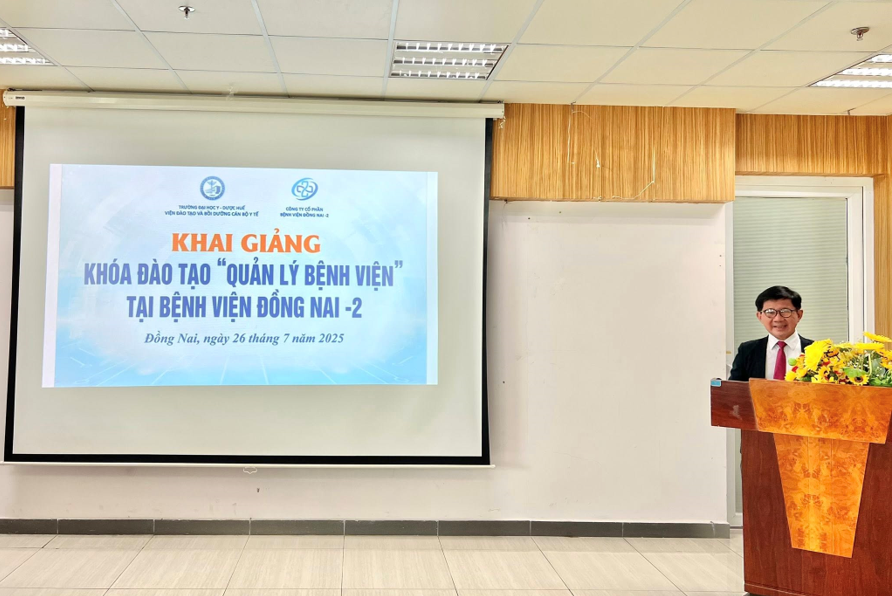 Sáng ngày 26/7/2025, Trường Đại học Y - Dược, Đại học Huế đã phối hợp với Công ty Cổ phần Bệnh viện Đồng Nai -2 tổ chức khai giảng Khóa đào tạo cấp chứng chỉ “Quản lý bệnh viện” dành cho các cán bộ y tế hiện đang công tác tại Bệnh viện. Tham gia lễ khai giảng, về phía Trường Đại học Y - Dược, Đại học Huế có TS.BS. Ngô Viết Lộc - Phó Giám đốc Phụ trách Viện Đào tạo và Bồi dưỡng cán bộ y tế, Tổ chức, quản lý và Phụ trách chuyên môn khóa học; về phía Công ty Cổ phần Bệnh viện Đồng Nai -2 có Ông Trần Minh Dương, Ông Trương Thiết Dũng, Ông Nguyễn Ngọc Hoàn là Ban Tổng Giám đốc Công ty và sự có mặt của 51 học viên.