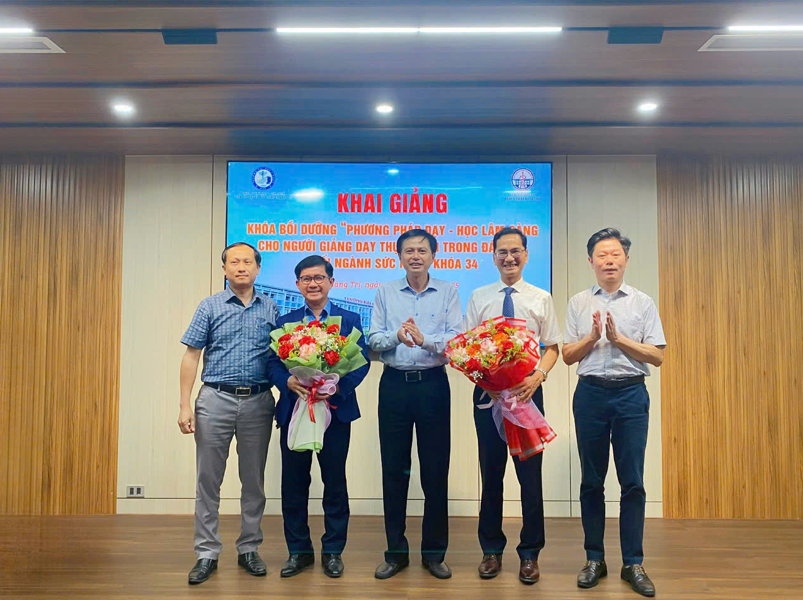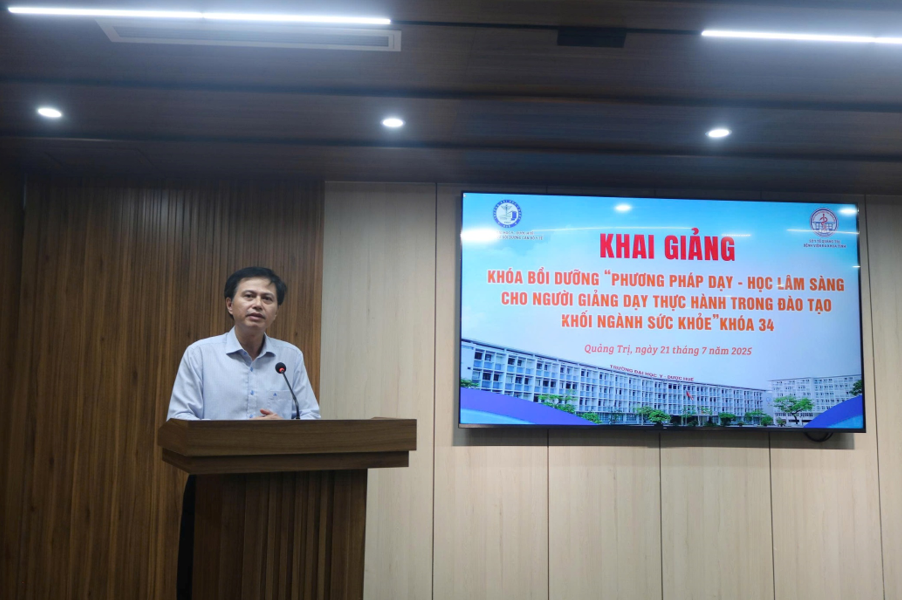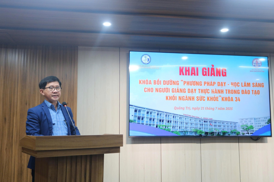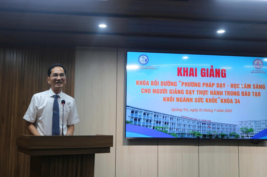 Ngày 21/07, Trường Đại học Y - Dược, Đại học Huế đã phối hợp với Bệnh viện Đa khoa tỉnh Quảng Trị tổ chức khai giảng Khóa bồi dưỡng “Phương pháp dạy - học lâm sàng cho người giảng dạy thực hành trong đào tạo khối ngành sức khỏe” dành cho các cán bộ y tế đang công tác tại bệnh viện. Tham gia lễ khai giảng, về phía Trường Đại học Y - Dược, Đại học Huế có TS.BS. Lê Văn Chi - Nguyên Chủ tịch Hội đồng trường, Nguyên Phó Trưởng Bộ môn Nội, TS.BS. Ngô Viết Lộc - Phó Giám đốc Phụ trách Viện Đào tạo và Bồi dưỡng cán bộ y tế , PGS.TS. Đặng Công Thuận - Trưởng Phòng Khoa học công nghệ - Hợp tác quốc tế, TS.BS. Nguyễn Văn Minh - Phó Trưởng Khoa Răng Hàm Mặt; về phía Bệnh viện Đa khoa tỉnh Quảng Trị có BSCKII. Phan Xuân Nam - Giám đốc Bệnh viện, ThS.BS. Lê Văn Lâm - Phó Giám đốc Bệnh viện, TS.BS. Trương Vĩnh Quý - Phó Giám đốc Bệnh viện và sự có mặt của 28 học viên. Phát biểu tại lễ khai giảng, BSCKII. Phan Xuân Nam - Giám đốc Bệnh viện nhấn mạnh việc ký kết hợp tác với Trường Đại học Y - Dược, Đại học Huế đã đưa Bệnh viện Đa khoa tỉnh Quảng Trị trở thành cơ sở thực hành của Nhà trường, đây cũng là nền tảng để Bệnh viện tiếp tục thực hiện tốt công tác phối hợp trong đào tạo nguồn nhân lực y tế chất lượng cao cho khu vực miền Trung và cả nước.