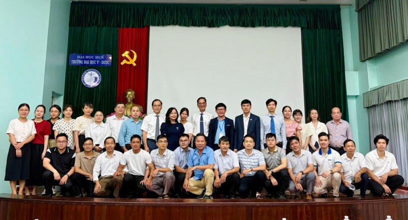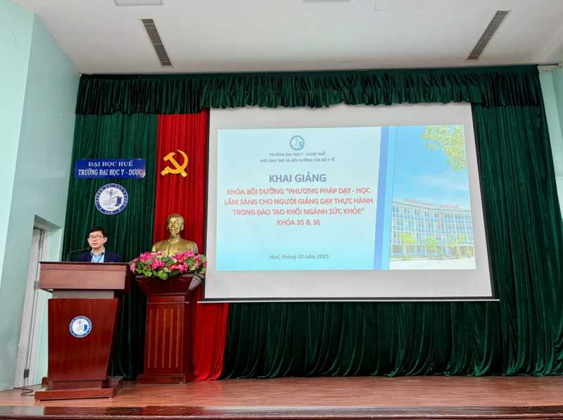 Sáng ngày 03/10, Trường Đại học Y - Dược, Đại học Huế đã tổ chức khai giảng 02 Khóa bồi dưỡng “Phương pháp dạy - học lâm sàng cho người giảng dạy thực hành trong đào tạo khối ngành sức khỏe” dành cho các cán bộ y tế đang công tác tại một số bệnh viện, trung tâm y tế trên địa bàn thành phố Huế. Tham gia lễ khai giảng, về phía Trường Đại học Y - Dược, Đại học Huế có TS. BS. GVCC. Lê Văn Chi - Nguyên Chủ tịch Hội đồng trường, Nguyên Phó Trưởng Bộ môn Nội, PGS. TS. GVCC. Đặng Công Thuận - Trưởng Phòng Khoa học công nghệ - Hợp tác quốc tế, PGS. TS. GVCC. Hoàng Anh Tiến - Phó Trưởng Bộ môn Nội, TS. BS. GVC. Nguyễn Thị Kim Anh - Phó Trưởng Bộ môn Phụ sản, TS. BS. GVC. Nguyễn Văn Minh - Phó Trưởng Khoa Phụ trách Khoa Răng Hàm Mặt, TS. BS. GVC. Ngô Viết Lộc - Phó Giám đốc Phụ trách Viện Đào tạo và Bồi dưỡng cán bộ y tế, và sự có mặt của 77 học viên Khóa 35 và Khóa 36.