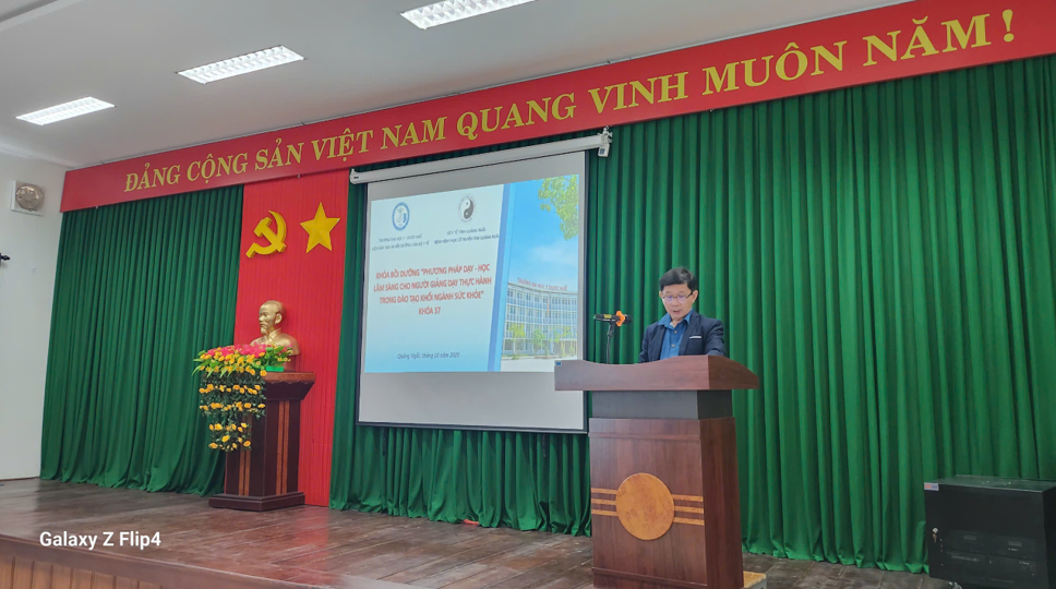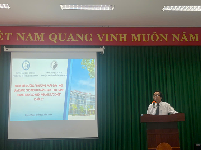 Ngày 14/10, Trường Đại học Y - Dược, Đại học Huế đã phối hợp với Bệnh viện Y học cổ truyền tỉnh Quảng Ngãi tổ chức khai giảng Khóa bồi dưỡng “Phương pháp dạy - học lâm sàng cho người giảng dạy thực hành trong đào tạo khối ngành sức khỏe” dành cho các cán bộ y tế đang công tác tại Bệnh viện Y học cổ truyền tỉnh Quảng Ngãi, Trung tâm Y tế Quảng Ngãi, Trung tâm Y tế Sơn Tịnh và Trung tâm Y tế Tư Nghĩa. Tham gia lễ khai giảng, về phía Trường Đại học Y - Dược, Đại học Huế có TS.BS. Lê Văn Chi - Giảng viên cao cấp Bộ môn Nội, TS.BS. Ngô Viết Lộc - Phó Giám đốc Phụ trách Viện Đào tạo và Bồi dưỡng cán bộ y tế , PGS.TS. Đặng Công Thuận - Trưởng Phòng Khoa học công nghệ - Hợp tác quốc tế, TS.BS. Đoàn Văn Minh - Trưởng Khoa Y học cổ truyền; về phía Bệnh viện Y học cổ truyền tỉnh Quảng Ngãi có BSCKII. Nguyễn Thành - Bí thư chi bộ, Giám đốc Bệnh viện, ThS.BS. Trần Vương Uyên Phương - Phó Bí thư chi bộ, Phó Giám đốc Bệnh viện và sự có mặt của 35 học viên đến từ 4 đơn vị y tế trên địa bàn tỉnh Quảng Ngãi. Phát biểu tại lễ khai giảng, BSCKII. Nguyễn Thành - Bí thư chi bộ, Giám đốc Bệnh viện gửi lời cảm ơn đến Trường Đại học Y - Dược, Đại học Huế vì đã phối hợp với Bệnh viện để tổ chức lớp học hết sức ý nghĩa, đồng thời hy vọng sau khi kết thúc lớp học, các học viên có thể vận dụng kiến thức được học để tham gia giảng dạy thực hành lâm sàng tại bệnh viện, góp phần nâng cao chất lượng nguồn nhân lực y tế của tỉnh nhà.