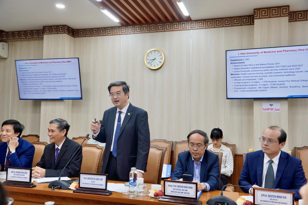Tại buổi làm việc, GS.TS. Nguyễn Vũ Quốc Huy - Phó Bí thư Đảng uỷ, Hiệu trưởng Nhà trường giới thiệu tổng quan về quá trình hình thành, phát triển, mô hình Trường - Viện, cũng như các định hướng chiến lược trong đào tạo nguồn nhân lực y tế chất lượng cao, nghiên cứu khoa học, chuyển giao kỹ thuật và hội nhập quốc tế. Đặc biệt, Hiệu trưởng nhấn mạnh vai trò của Bệnh viện Trường Đại học Y - Dược Huế trong đào tạo thực hành, nghiên cứu lâm sàng và chăm sóc sức khỏe cộng đồng khu vực miền Trung - Tây Nguyên và cả nước.