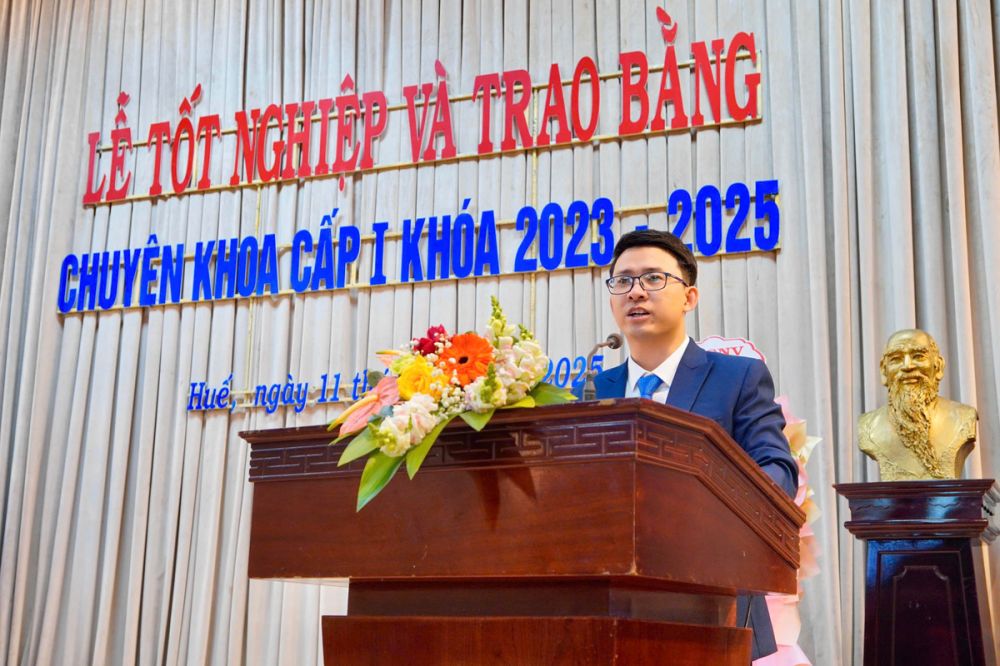 Đại diện cho 600 học viên tốt nghiệp, tân bác sĩ chuyên khoa cấp I Võ Văn Phong bày tỏ lòng biết ơn sâu sắc đến quý thầy cô - những người đã dành trọn tâm huyết, trí tuệ và tình yêu nghề cho các học viên. Anh khẳng định, với tình yêu nghề và giá trị nhân văn của ngành Y, mỗi học viên sẽ luôn giữ vững ngọn lửa đam mê, lòng nhân ái và tinh thần cống hiến để phục vụ nhân dân, xứng đáng với niềm tin mà xã hội gửi gắm vào người thầy thuốc.