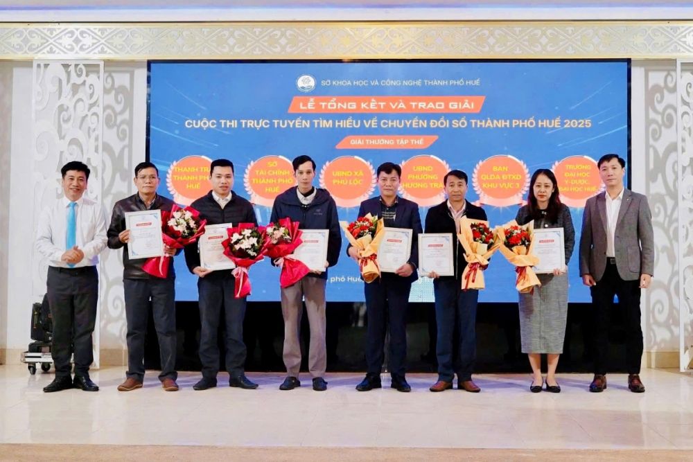 Trường Đại học Y - Dược, Đại học Huế (ngoài cùng bên phải) được tuyên dương là tập thể có thành tích nổi bật, tham gia tích cực, chất lượng tại Cuộc thi trực tuyến tìm hiểu về Chuyển đổi số năm 2025