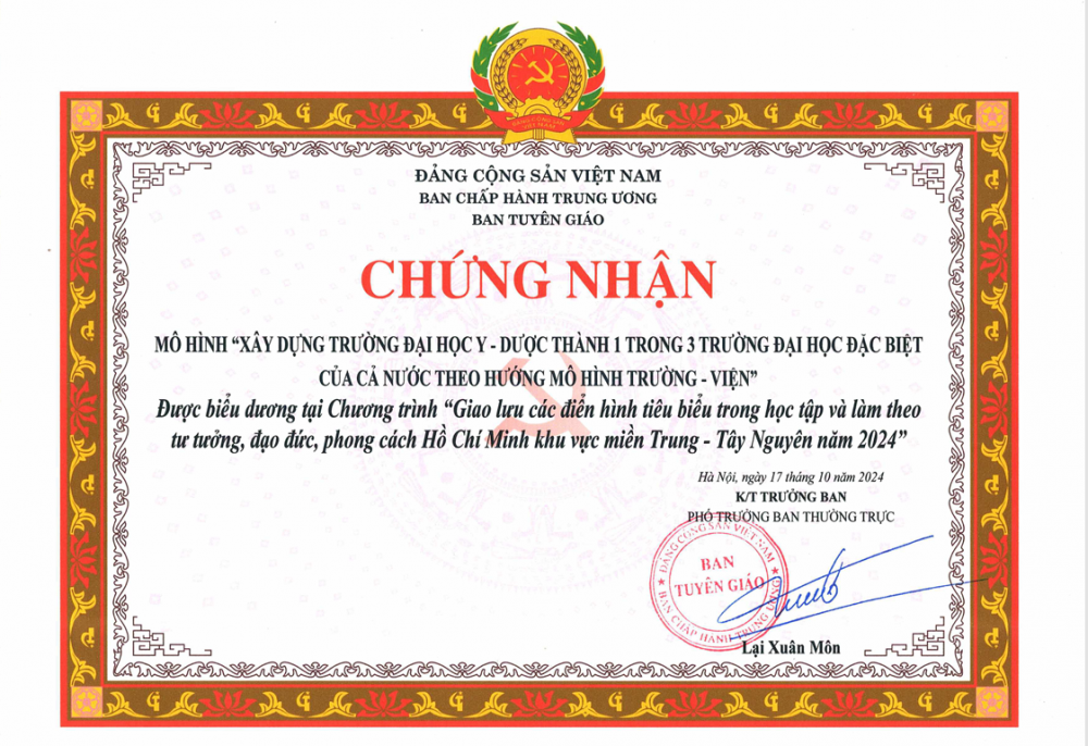 Từ năm 1992 đến nay, Đảng bộ Nhà trường liên tục được Đảng ủy Đại học Huế công nhận danh hiệu “Đảng bộ trong sạch, vững mạnh”. Được Tỉnh ủy Thừa Thiên Huế tặng “Đảng bộ Trường Đại học Y khoa Huế đạt trong sạch, vững mạnh” từ 1997 đến 2005 và “Đạt thành tích xuất sắc trong nhiệm kỳ 2005-2010”, nhiều bằng khen của Trung ương, của Tỉnh ủy và của Đảng ủy Đại học Huế.