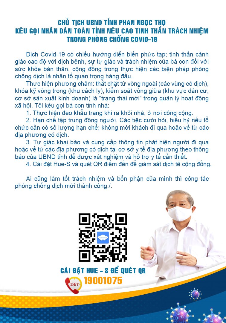 Trước diễn biến phức tạp của dịch bệnh Covid-19, Chủ tịch UBND tỉnh Thừa Thiên Huế Phan Ngọc Thọ đã phát đi thông điệp kêu gọi nhân dân toàn tỉnh cảnh...