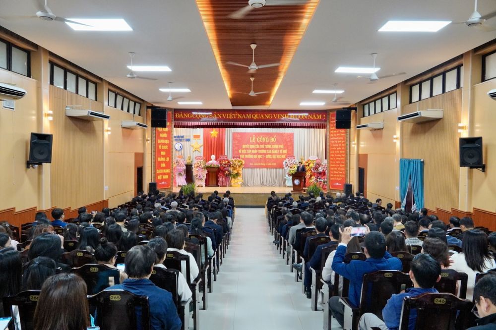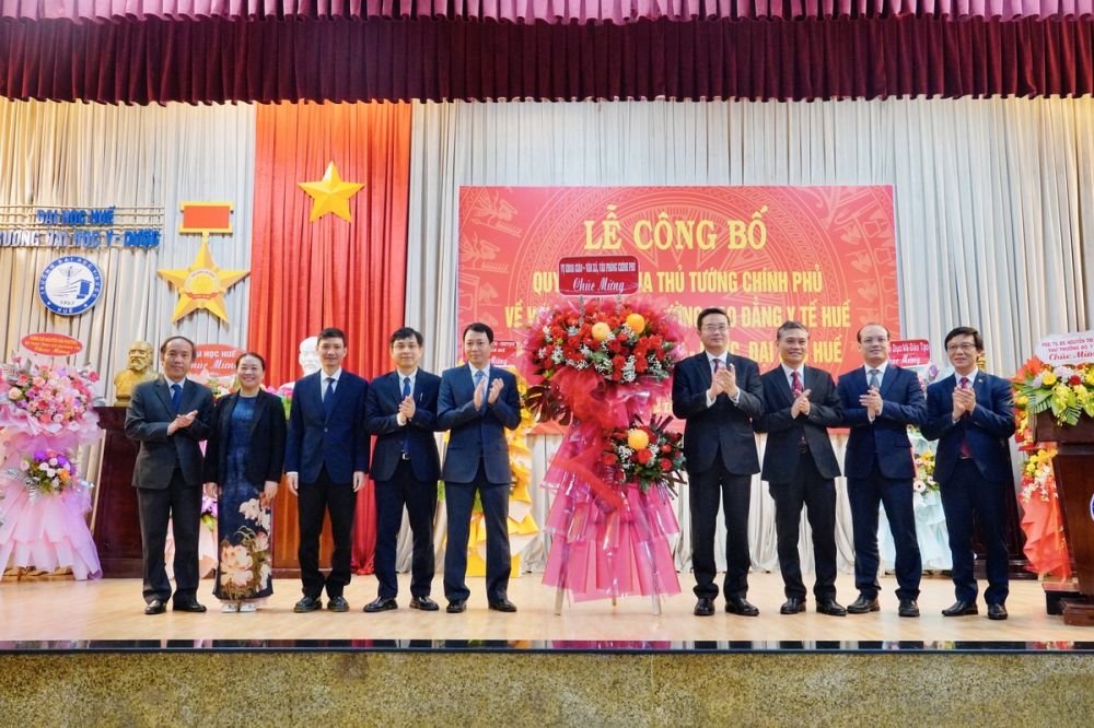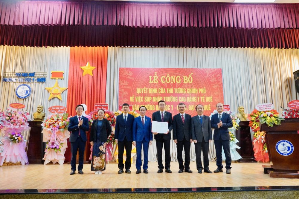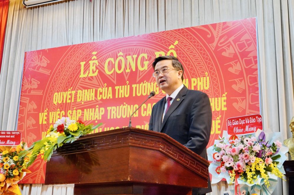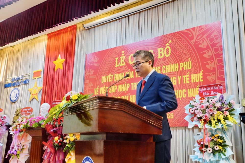 Tại buổi lễ, TS. Hoàng Bách Việt - Phó Vụ trưởng Vụ Tổ chức cán bộ, Bộ Giáo dục và Đào tạo đã Công bố Quyết định số 2346/QĐ-TTg ngày 23/10/2025 của Thủ tướng Chính phủ về việc sáp nhập Trường Cao đẳng Y tế Huế vào Trường Đại học Y - Dược, Đại học Huế.