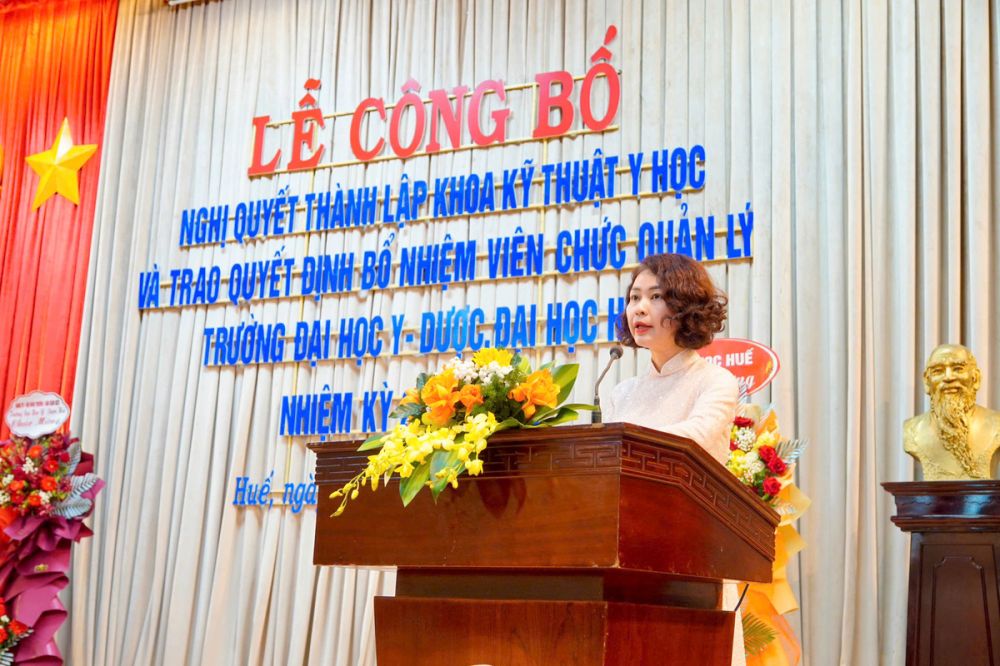 Phát biểu giao nhiệm vụ cho các viên chức được bổ nhiệm, GS. TS. Nguyễn Vũ Quốc Huy - Hiệu trưởng Trường Đại học Y - Dược, Đại học Huế nhấn mạnh: “Tập thể Lãnh đạo Nhà trường cam kết tạo mọi điều kiện thuận lợi nhất để Khoa Kỹ thuật Y học phát triển mạnh mẽ, trở thành đơn vị đào tạo kỹ thuật y học trình độ cao đẳng và liên thông hàng đầu của cả nước, góp phần thực hiện thắng lợi các mục tiêu chiến lược của Trường Đại học Y - Dược, Đại học Huế, trong đó có các lĩnh vực chủ chốt là tiếp tục phát triển mạnh nguồn lực con người, nâng cao chất lượng đào tạo, tăng cường liên thông giữa các hệ đào tạo, phát triển các chương trình liên ngành và liên kết đào tạo quốc tế, thực hiện thành công nhiệm vụ kiểm định chất lượng chương trình đào tạo, tích cực chủ trì và tham gia vào các nhiệm vụ khoa học công nghệ và phục vụ cộng đồng”. Hiệu trưởng Nhà trường kỳ vọng các cán bộ quản lý được bổ nhiệm sẽ là những người truyền cảm hứng, dẫn dắt, đồng hành, kiến tạo môi trường làm việc tích cực, sáng tạo, gắn kết, phát triển, góp phần xây dựng Khoa Kỹ thuật Y học và Nhà trường ngày càng vững mạnh, uy tín, hội nhập quốc tế. Nhà trường cũng mong muốn các em sinh viên hệ cao đẳng - trong một môi trường học tập và rèn luyện mới, sẽ nỗ lực hơn nữa trong việc thực hiện tốt các nhiệm vụ đã được xã hội và gia đình giao phó trong giai đoạn này, đó là đạt được kết quả cao nhất trong học tập và rèn luyện, để trở thành những cán bộ y tế vừa “hồng” vừa “chuyên”, tự hoàn thiện bản thân để đóng góp tốt nhất cho gia đình, cho xã hội.