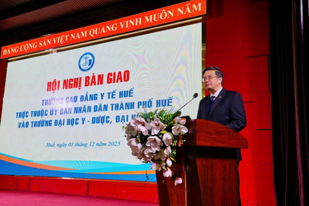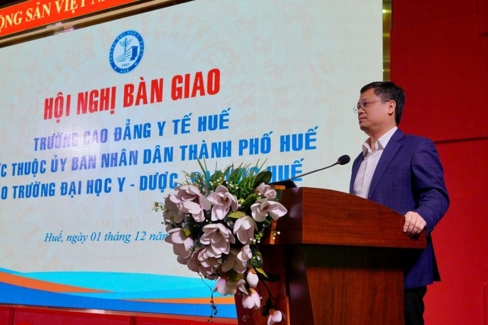 Đồng chí Nguyễn Thanh Bình - Uỷ viên Thường vụ Thành uỷ, Phó Chủ tịch Thường trực UBND thành phố Huế phát biểu chỉ đạo, nhấn mạnh tầm quan trọng của việc sắp xếp, nâng cao chất lượng đào tạo nhân lực y tế địa phương: “Việc bàn giao Trường Cao đẳng Y tế Huế về Trường Đại học Y - Dược, Đại học Huế không chỉ là sự chuyển giao về mặt tổ chức, mà còn là bước đi quan trọng nhằm thống nhất nguồn lực đào tạo y khoa trên địa bàn thành phố. Thành phố Huế tin tưởng rằng với kinh nghiệm, uy tín và hệ sinh thái giáo dục - nghiên cứu của Đại học Huế, Nhà trường sẽ tiếp tục phát triển, nâng cao chất lượng đào tạo, đáp ứng nhu cầu nguồn nhân lực y tế chất lượng cao trong bối cảnh mới”.